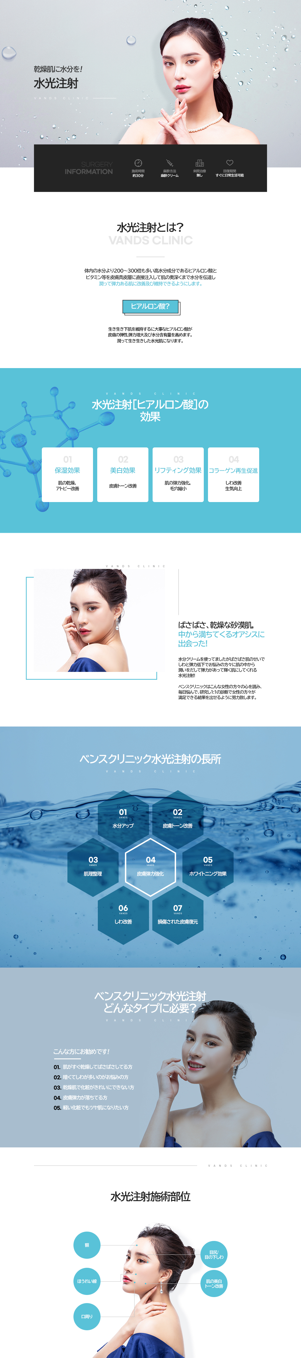 乾燥してパサついた状態のお肌に注射でヒアルロン酸をお肌の真皮層に注入し 乾燥したお肌に潤いを与え、しっかりとした潤い感でハリのあるお肌が期待できます